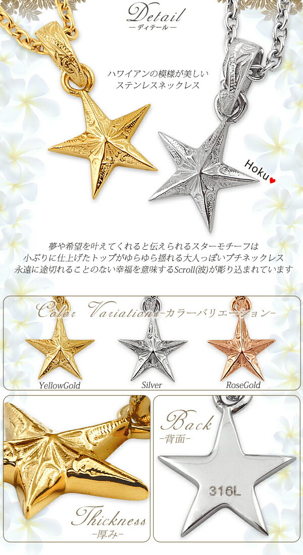 ハワイアンジュエリー ペアネックレス ステンレス 刻印無料 サージカルステンレス 金属アレルギー対応 ネックレス 星 スター スクロール あずきチェーン付き イエローゴールド ピンク ローズゴールド メンズ レディース ハワイアン ペンダント